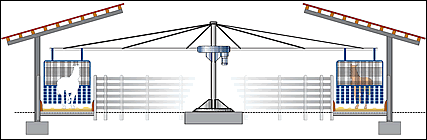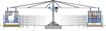 | Two different versions - "TN-Standard" "TN-Extra" offer a range of selection for every demand. The thermostat-controlled heating and ventilating system of the "TN-Extra" systems provides protection against extreme temperatures and ensures trouble-free operation. Movable safety horse-driving screens with replaceable screen inserts and rubber lamellas reduce the risk of injury. The drive unit is installed in a high position. The arms circle at a height of approx. 2.40 m. This creates an open interior space that guarantees maximum safety. The horse-driving screens and the entire rotating part of the system are insulated. Everything is prepared so that a pasture fence unit can be hooked up and connected at any time. The sturdy, hot-galvanized basic structure enables the construction of systems with virtually every desired diameter. A robust slewing ring ensures permanently smooth, easy and steady operation. Since the basic structure of, for example, a 15-metre system for 4 horses, is the same as for a 20-meter system for 8 horses, each system can be easily enlarged at any time later on. In order to be able to use the large interior space for longeing, Top Notch has now developed the suspended horse walker TN centre. The sturdy, hot-galvanized steel structure with the reliable drive unit of the conventional horsewalker system is suspended from the roof-ridge of the arena structure. Installed in 20-meter round arena, this provides an open interior space with a diameter of approx. 15 m that can be used as ideal longeing circle. Around that a fixed horse-guiding circle is set up. This suspended horse walker can, of course, also be installed in a customer- provided arena. However, the weight of the system must be taken into account for the arena structure in terms of statical requirements. |