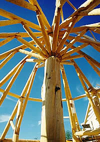 | Post and Beam buildings have a self-supporting skeletal structure built out of natural round logs. The logs are connected by proven traditional wood-to-wood joinery and are flattened at interface points to accommodate wall and roof elements. Structural difficulties can be overcome by use of knee braces and P&B trusses which are, if designed correctly, very attractive and decorative. The walls are usually filled in using conventional North American stick frame methods, with any kind of siding or stucco. Alternatives could be brick or rock walls, stresskin or even straw bale with adobe coating. |