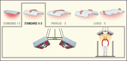 | Standard II-S The model STANDARD II-S is an ideal multi-purpose solarium. Two powerful elements ensure uniform and intensive radiation. 2 Polyester-housings, semi sealed, support track, 1 control box with timer and selector switches, chain suspension, 16 IR-bulbs ea. 250 watt, 4 UV-bulbs ea. 300 watt