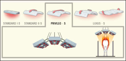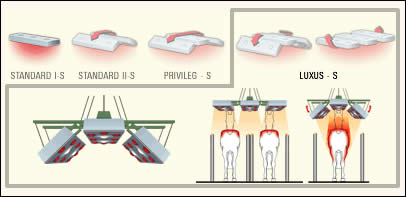 | PRIVILEG-S PRIVILEG-S is our advanced unit for most demanding radiation performance. Three solaria elements provide for an optimum field radiation. 3 Polyester-housings, semi sealed, support track, 1 control box with timer and selector switches, chain suspension, 24 IR-bulbs ea. 250 watt, 6 UV-bulbs ea. 300 watt