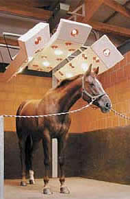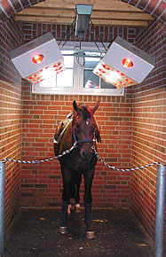 | LUXUS-S The tilting side elements in combination with the high radiation power allows users to create the ideal field of solar radiation for their valuable horses. 3 Polyester-housings, semi sealed, support track, 1 control box with timer and selector switches, chain suspension, motorised swivelling feature of the outside panels (60°) 24 IR-bulbs ea. 250 watt, 6 UV-bulbs ea. 300 watt