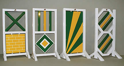 | Due to the basic materials being used, namely aluminium and waterproof plastic plates, the obstacles and courses can also be set up on the outdoor field permanently without rotting. This, of course, only applies to a limited extent to the rails and planks. In the case of Top Notch Jumps, the rails are, of course, made of wood - with all advantages and disadvantages of this material, such as drying cracks. The planks are made of a special softwood. This material does not crack. In the case of Top Notch Jumps, the rails, planks and gates are delivered on an optional basis in lengths of 3.00 m, 3.50 m or 4.00 m - at the same price. We recommend 3.00 m if the obstacles are mainly used in the arena or on small fields. If the obstacles are used in the large arena and on the outdoor field, a length of 3.50 m is advisable. However, the 4.00-m length is still delivered upon request. |